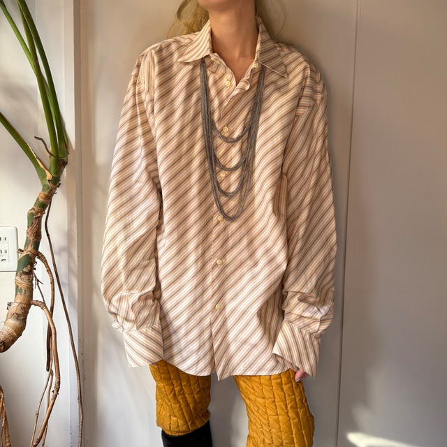 【size】 平置き:身幅59cm、肩幅52cm、袖丈66cm、着丈85cm ※多少の誤差がある場合がございます。 カラー: mix 素材 : cotton 100 モデル身長162cm ※コーディネートに使用しているアクセサリー類も販売可能ですので、ご希望があればお問い合わせくださいませ。 【details】 ・斜めにプリントされたストライプ柄が印象的なコットンシャツ。 マスタードの配色カラーが絶妙に可愛い一枚です。 ・インナーアイテムとしてはもちろん、一枚で着ても主役級の存在感を放ってくれます。 いまの時期はもちろん、春や秋の季節の変わり目には特に大活躍してくれます。 【condition】 目立った汚れやダメージはありません。 *当店の商品は一部を除き古着・used品です。 特性上、汚れ、ほつれ、スレ、生地の傷み、サビ、匂い、縫製不良などがある場合がございます。 また、使用にあたり、現時点では確認できないダメージがある可能性もあります。 お選びの際はコンディションをご理解の上お買い求め下さい。 またミリタリー商品はアイテムによって使用している付属や仕様、素材の色が異なることがございます。 *配送方法をレターパック、こねこ便にされた場合、日時指定はできかねます。 (システム上日時指定できてしまいますが、実際は承ることができません) *ご覧いただいているモニターにより色の出方が異なる場合がございます。 *商品の劣化、ほつれ、色落ち、汚れ、イメージと違った、などの理由での返品、交換はお断りしています。 気になる点は必ずご購入前にお問い合わせ下さい。 *ご注文後のキャンセルは承れません。 *環境問題の観点によるペーパーレス化のため、納品書は同梱しておりません。納品書、または領収書をご希望の方は備考欄にご記入くださいませ。 *レターパックライトに配達補償がございません。 配達事故が起きた場合、 いかなる理由(紛失、盗難、破損など)でも代替え商品の発送や返金など行っておりません。 ご了承頂けるお客様のみご利用ください。