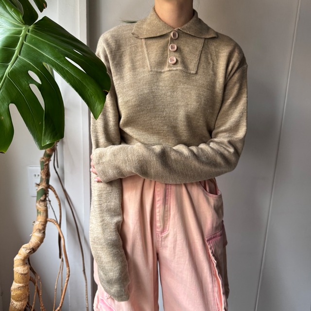 【size】 平置き:身幅52cm、肩幅48cm、袖丈67cm、身丈62cm ※多少の誤差がある場合がございます。 カラー: beige 素材 : 不明(恐らくウールだと思われます) モデル身長162cm ※コーディネートに使用しているアクセサリー類も販売可能ですので、ご希望があればお問い合わせくださいませ。 【details】 ・1970年代ならではな大きめの衿に、ヘンリーネックのさり気ないデザインが可愛いニットセーター。 中に薄手のタートルネックを着ても可愛いですし、逆に上にスウェットやニットを着て衿元からヘンリーネックをチラ見せさせても素敵です。 ・ミックス感のある杢ベージュの色味も絶妙です。 合わせる色を選ばず様々なスタイリングをお楽しみ頂けます。 【condition】 目立った汚れやダメージはありません。 *当店の商品は一部を除き古着・used品です。 特性上、汚れ、ほつれ、スレ、生地の傷み、サビ、匂い、縫製不良などがある場合がございます。 また、使用にあたり、現時点では確認できないダメージがある可能性もあります。 お選びの際はコンディションをご理解の上お買い求め下さい。 またミリタリー商品はアイテムによって使用している付属や仕様、素材の色が異なることがございます。 *配送方法をレターパック、こねこ便にされた場合、日時指定はできかねます。 (システム上日時指定できてしまいますが、実際は承ることができません) *ご覧いただいているモニターにより色の出方が異なる場合がございます。 *商品の劣化、ほつれ、色落ち、汚れ、イメージと違った、などの理由での返品、交換はお断りしています。 気になる点は必ずご購入前にお問い合わせ下さい。 *ご注文後のキャンセルは承れません。 *環境問題の観点によるペーパーレス化のため、納品書は同梱しておりません。納品書、または領収書をご希望の方は備考欄にご記入くださいませ。 *レターパックライトに配達補償がございません。 配達事故が起きた場合、 いかなる理由(紛失、盗難、破損など)でも代替え商品の発送や返金など行っておりません。 ご了承頂けるお客様のみご利用ください。