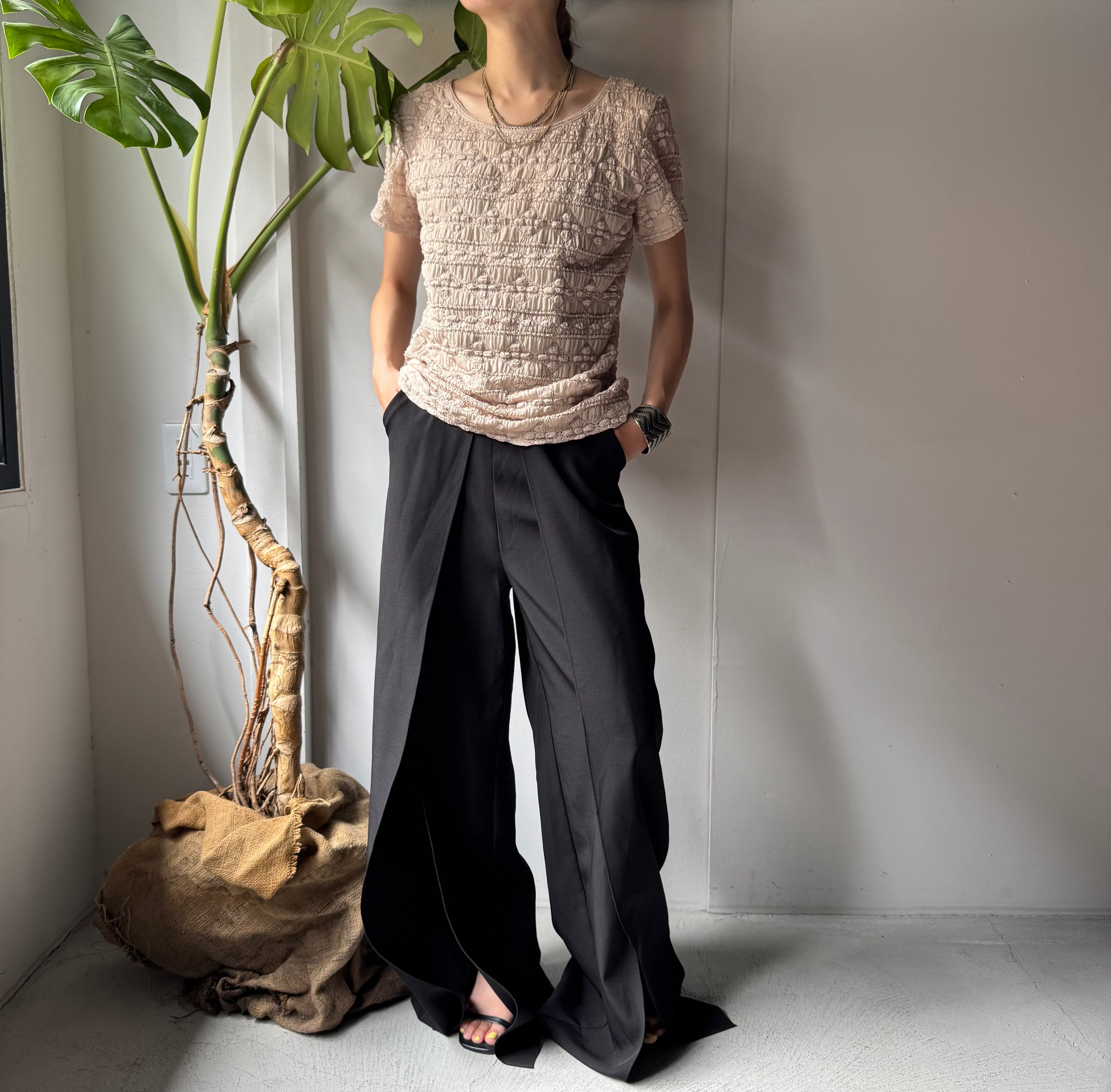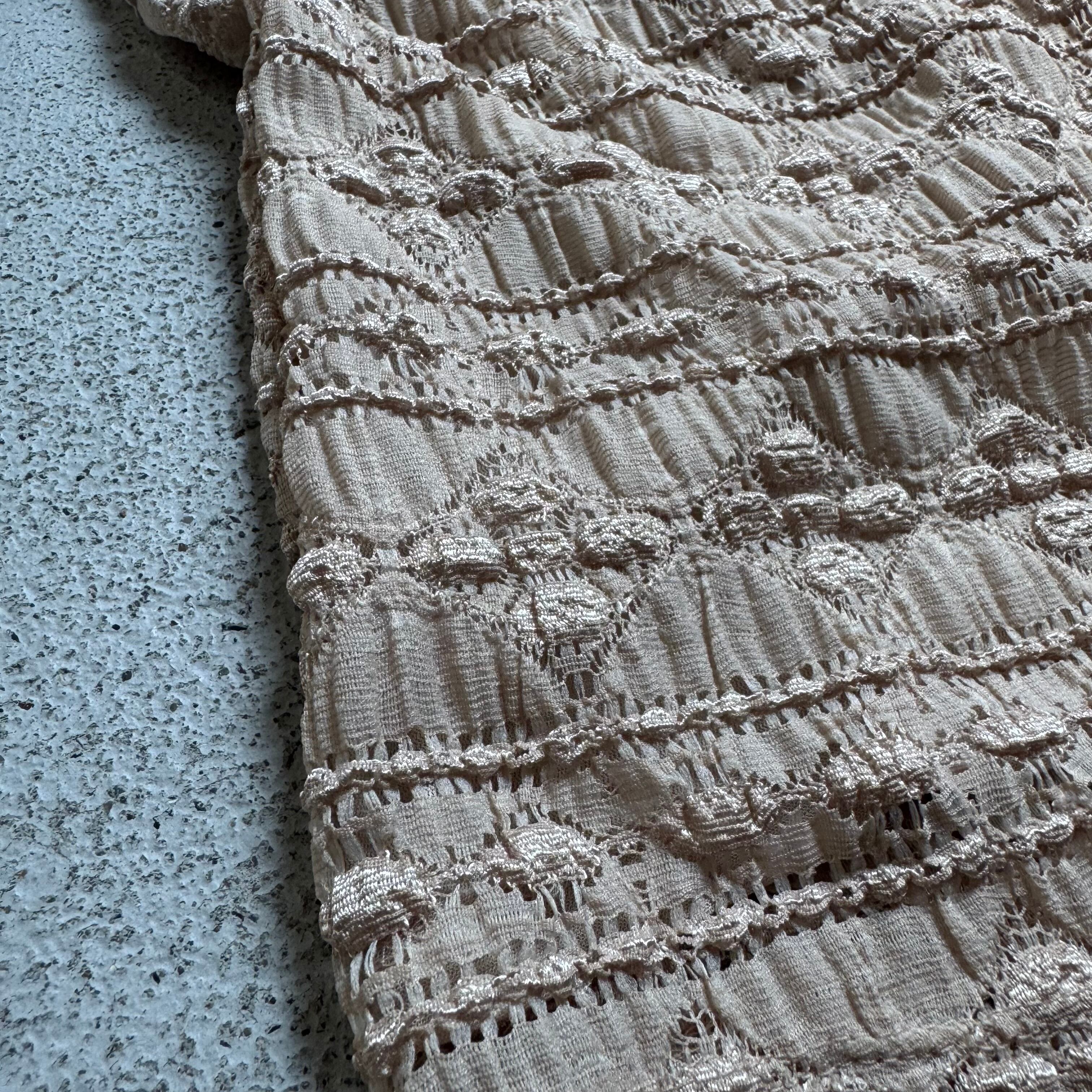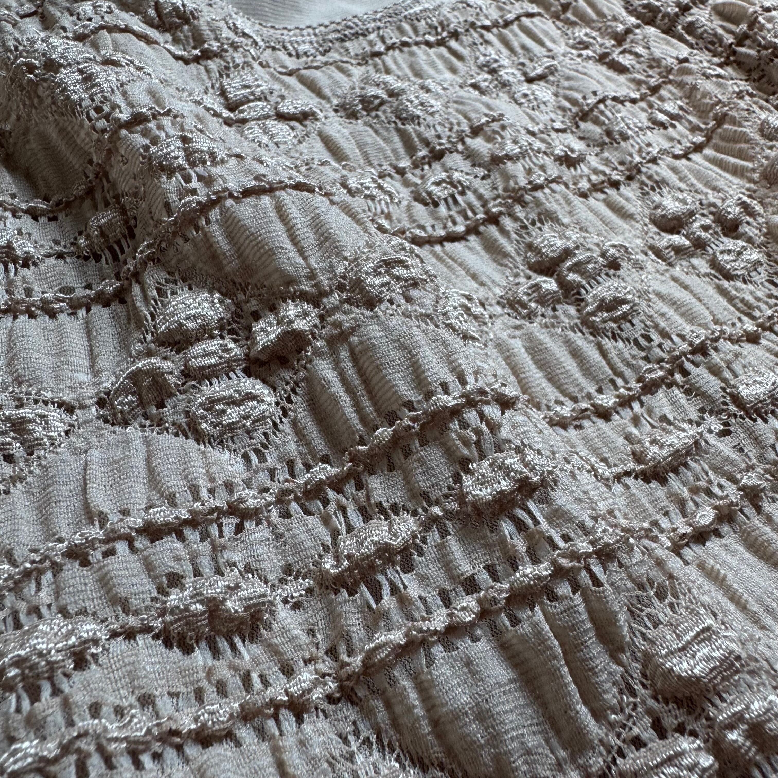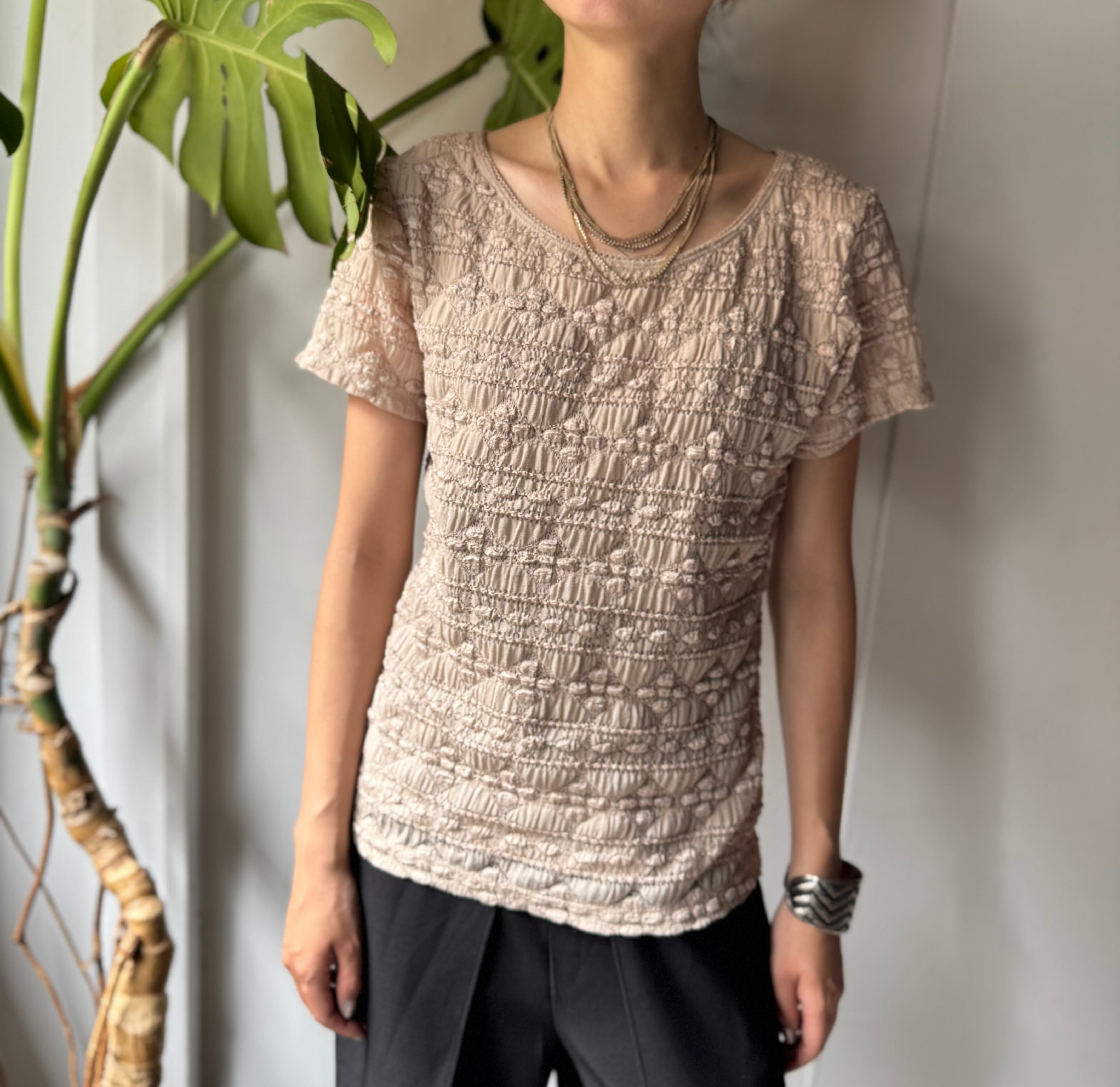 ・伸縮性のあるレース素材、Tシャツ感覚でご着用頂ける上にTシャツより品があって華やかな、夏に大活躍してくれるお品物です。