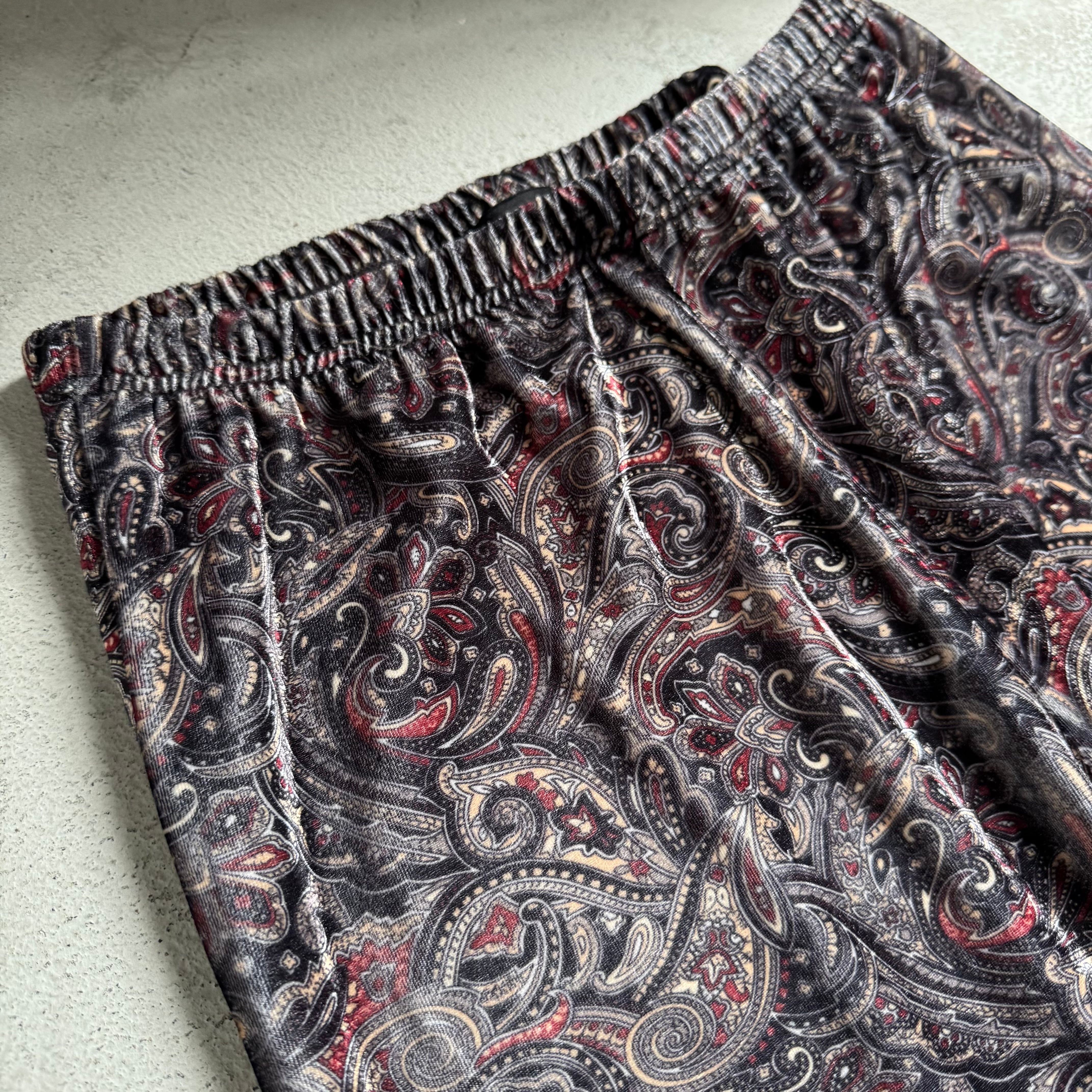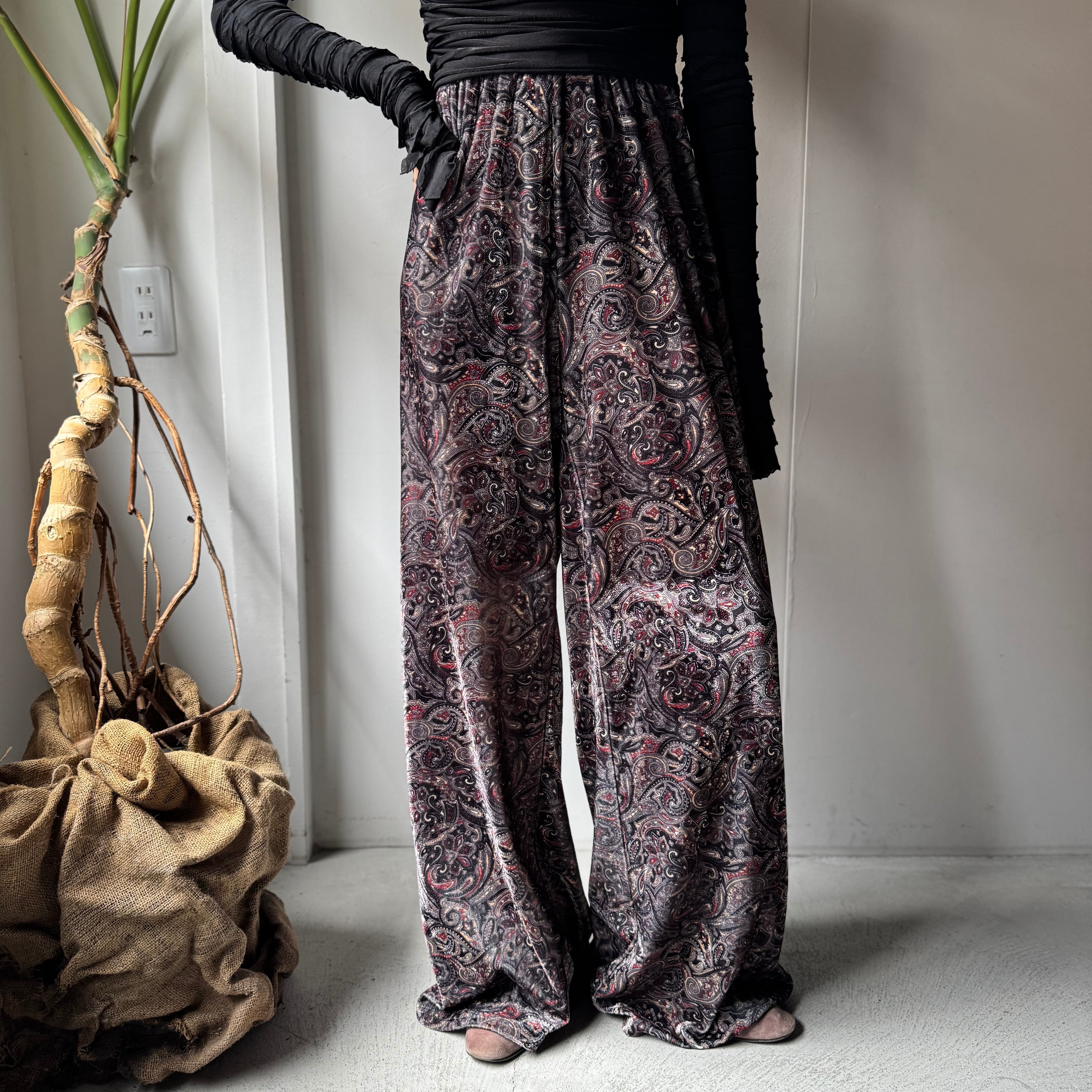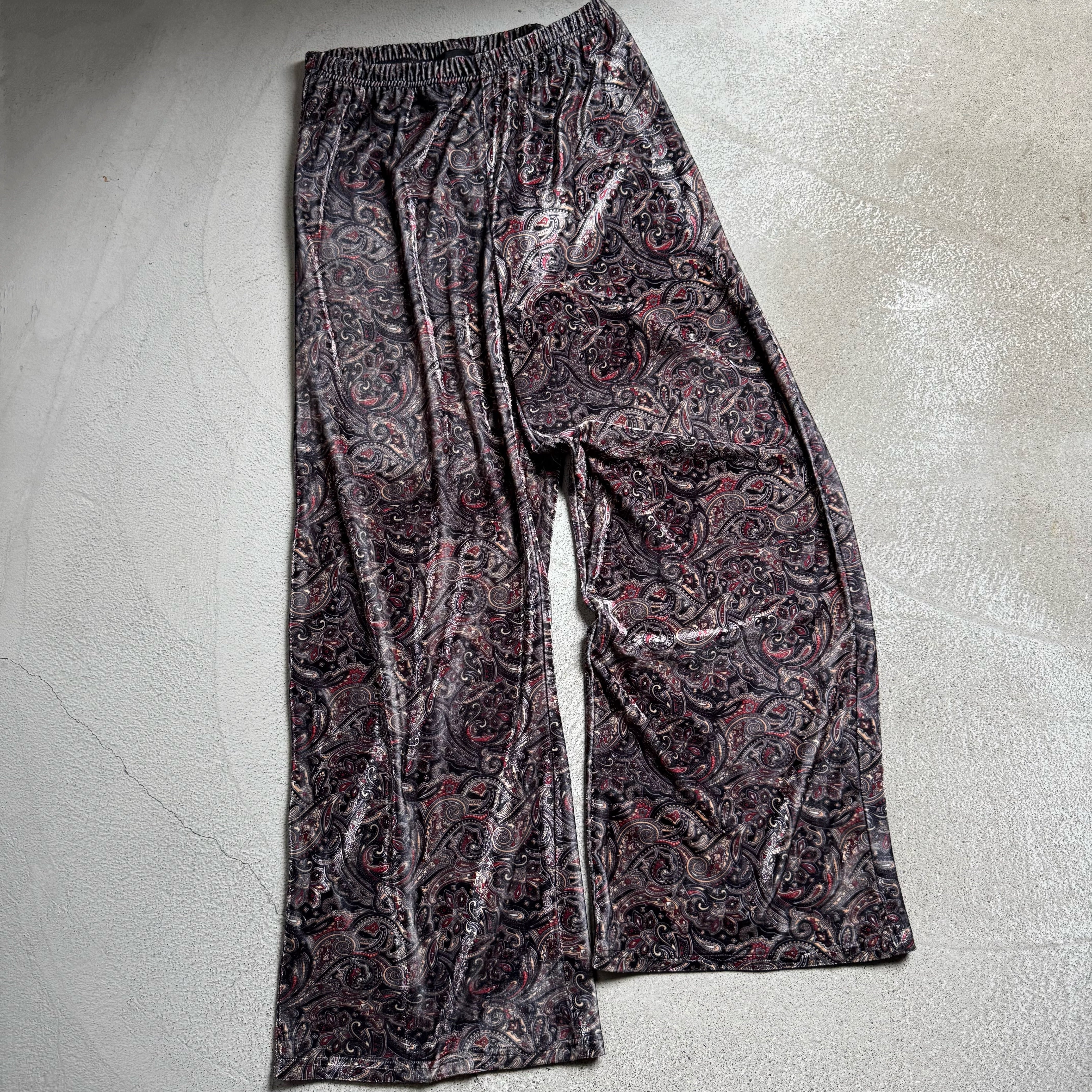 ・雰囲気のあるペイズリー柄にテロテロベロア素材、そして存在感のある極太ワイドシルエット。