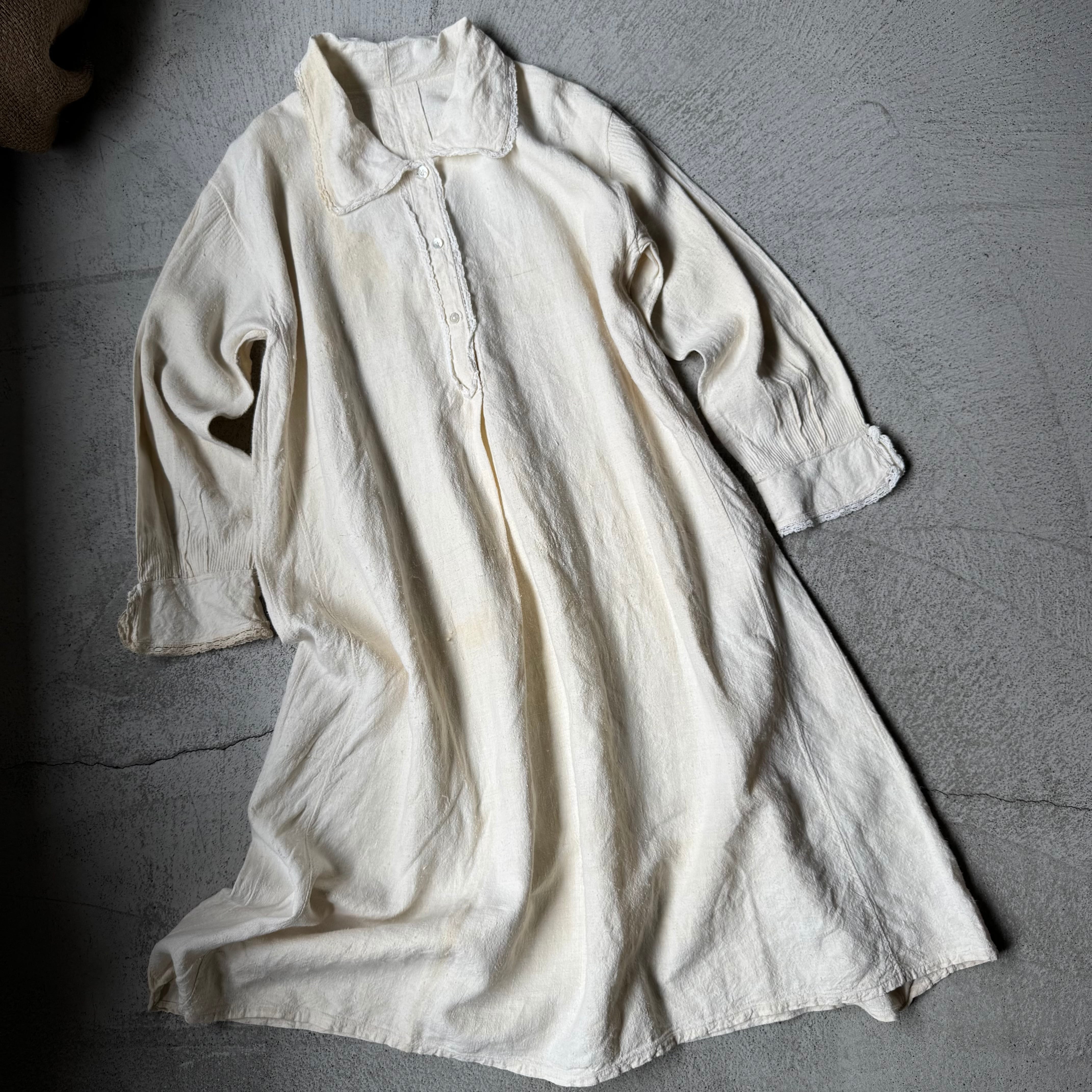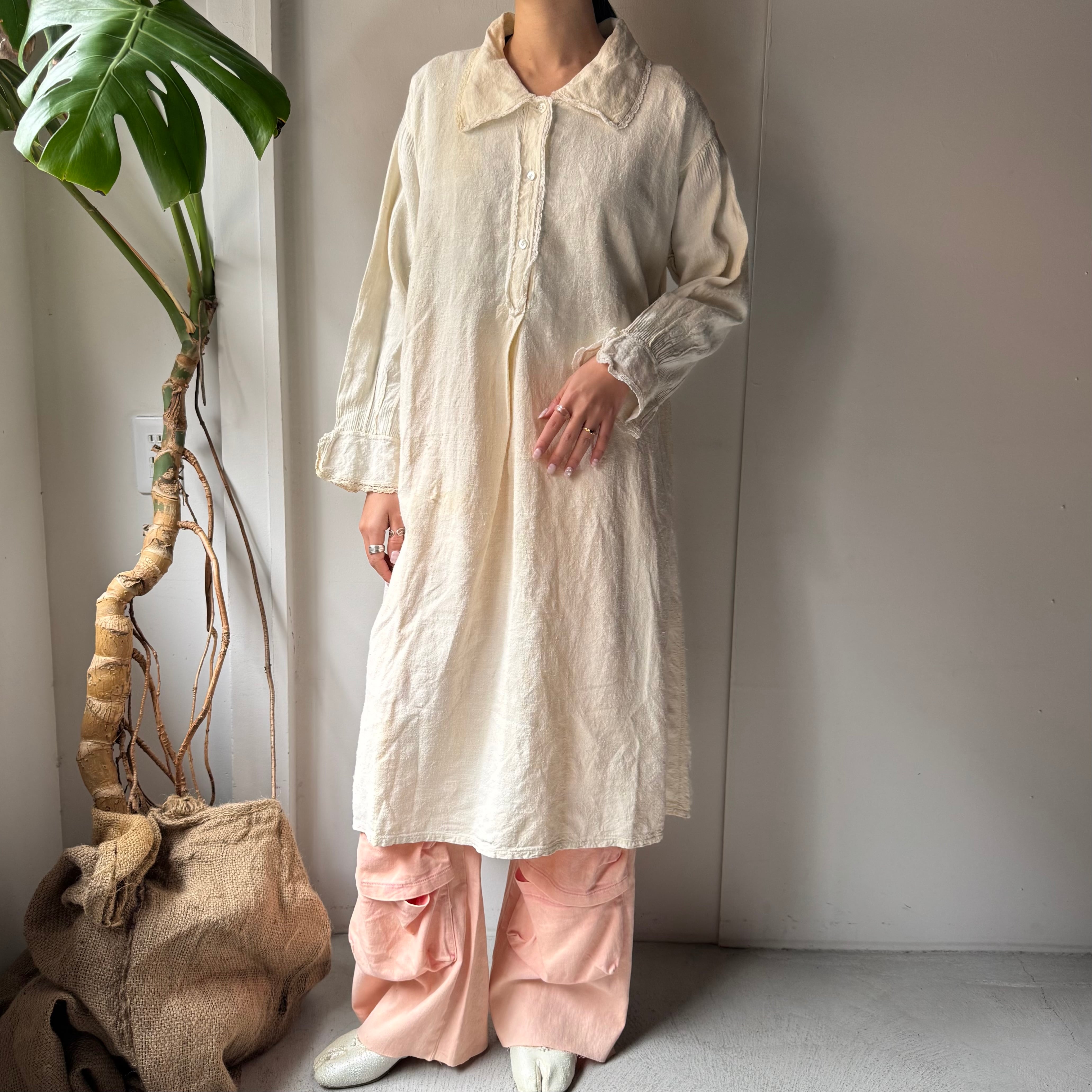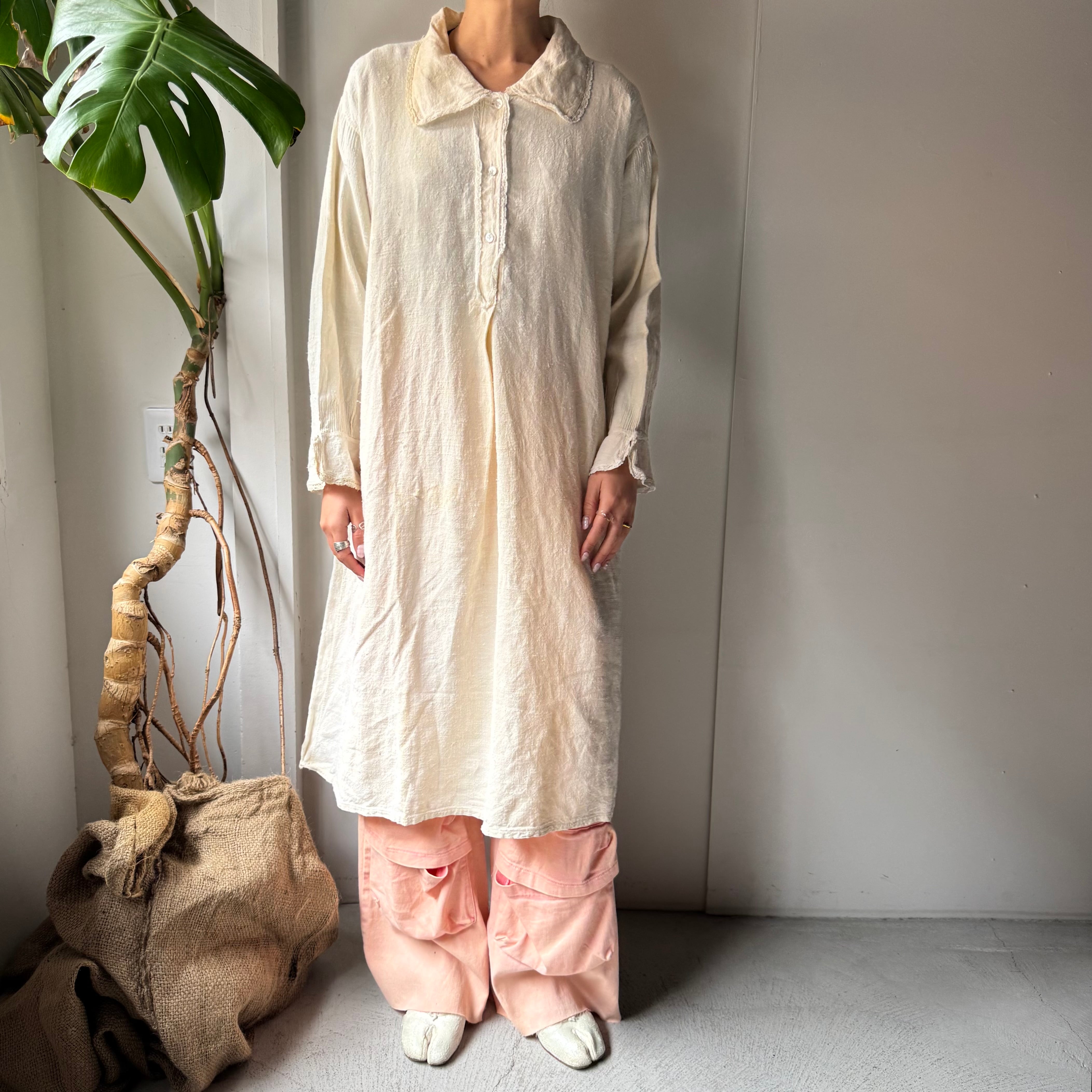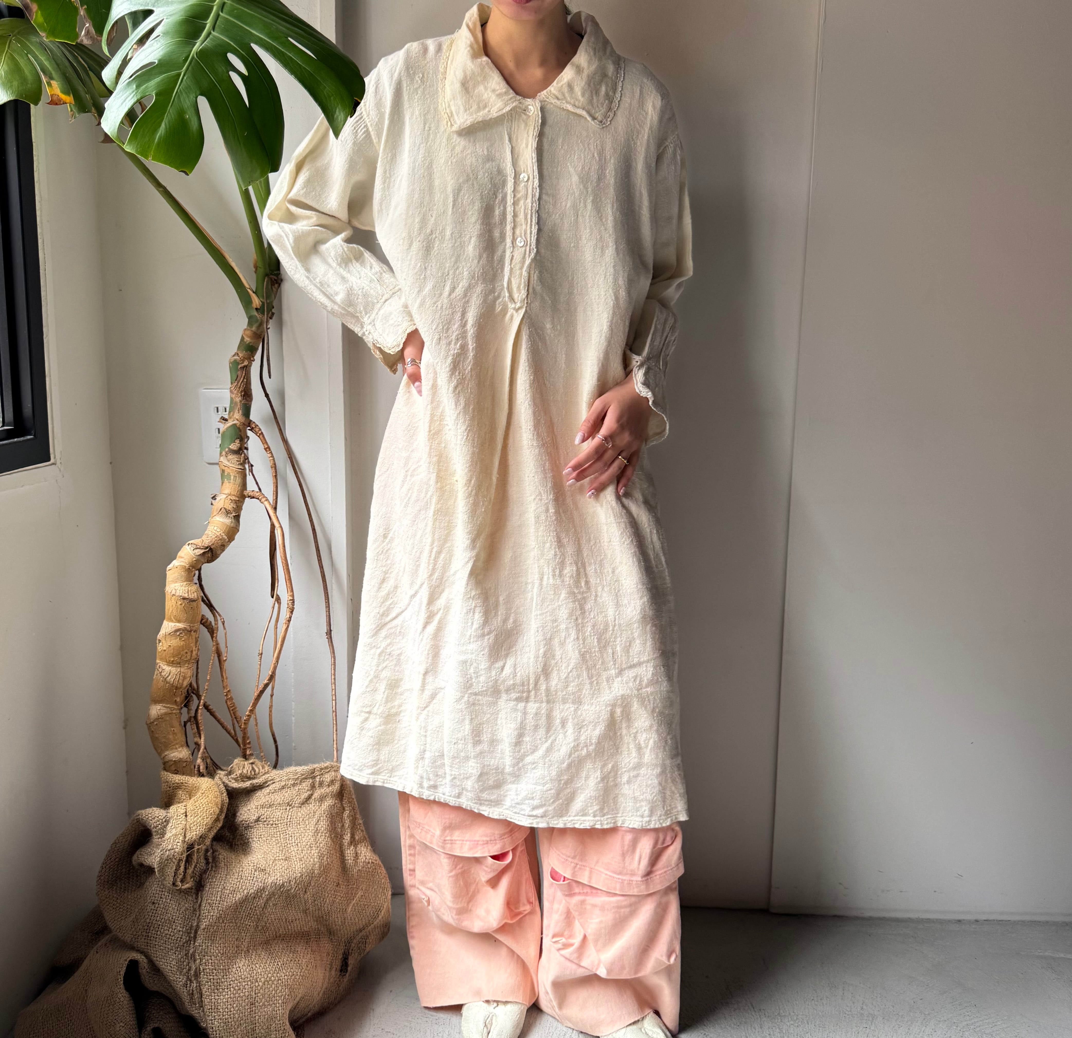この手のアンティークワンピースは、ゴワッとしたようなリネン素材のものが多いですが、こちらは柔らかな風合いの素材(恐らくコットン×リネンかと思われます)