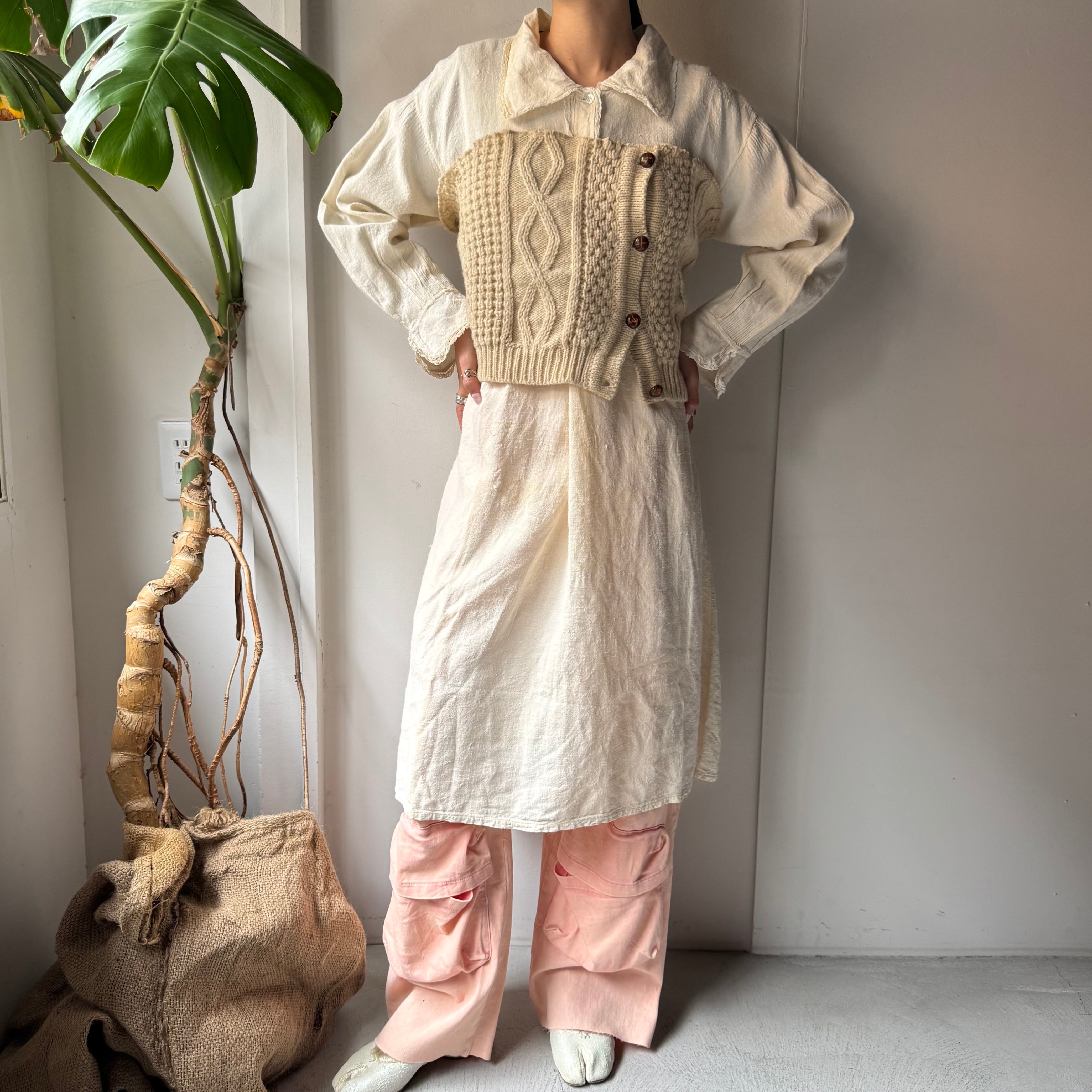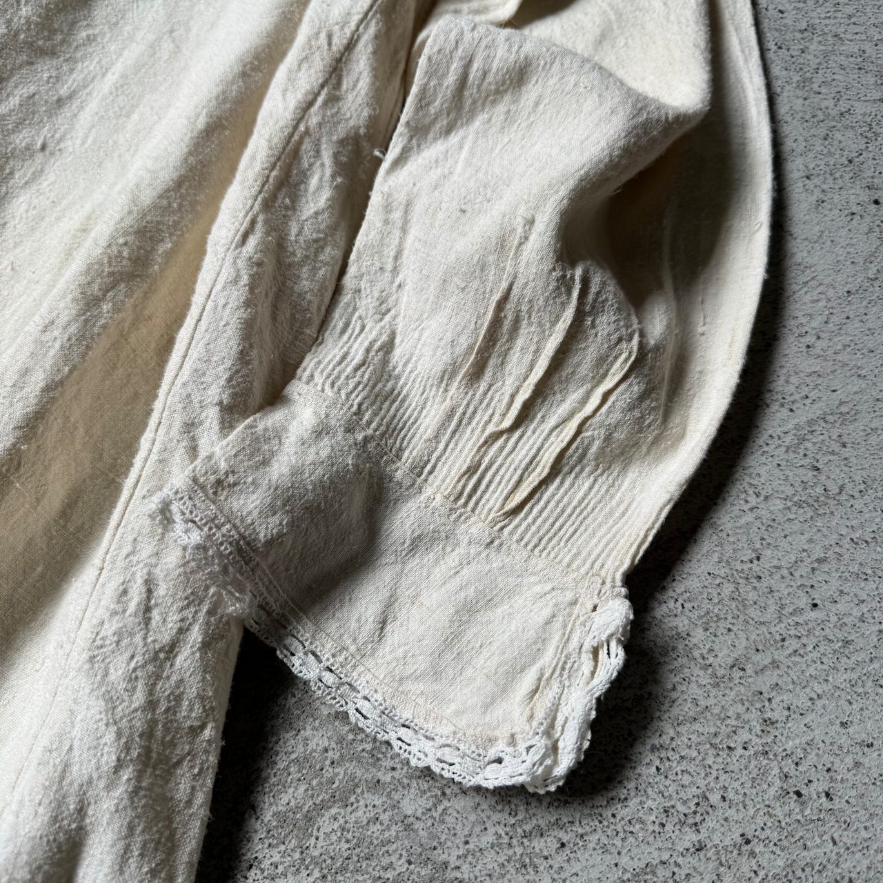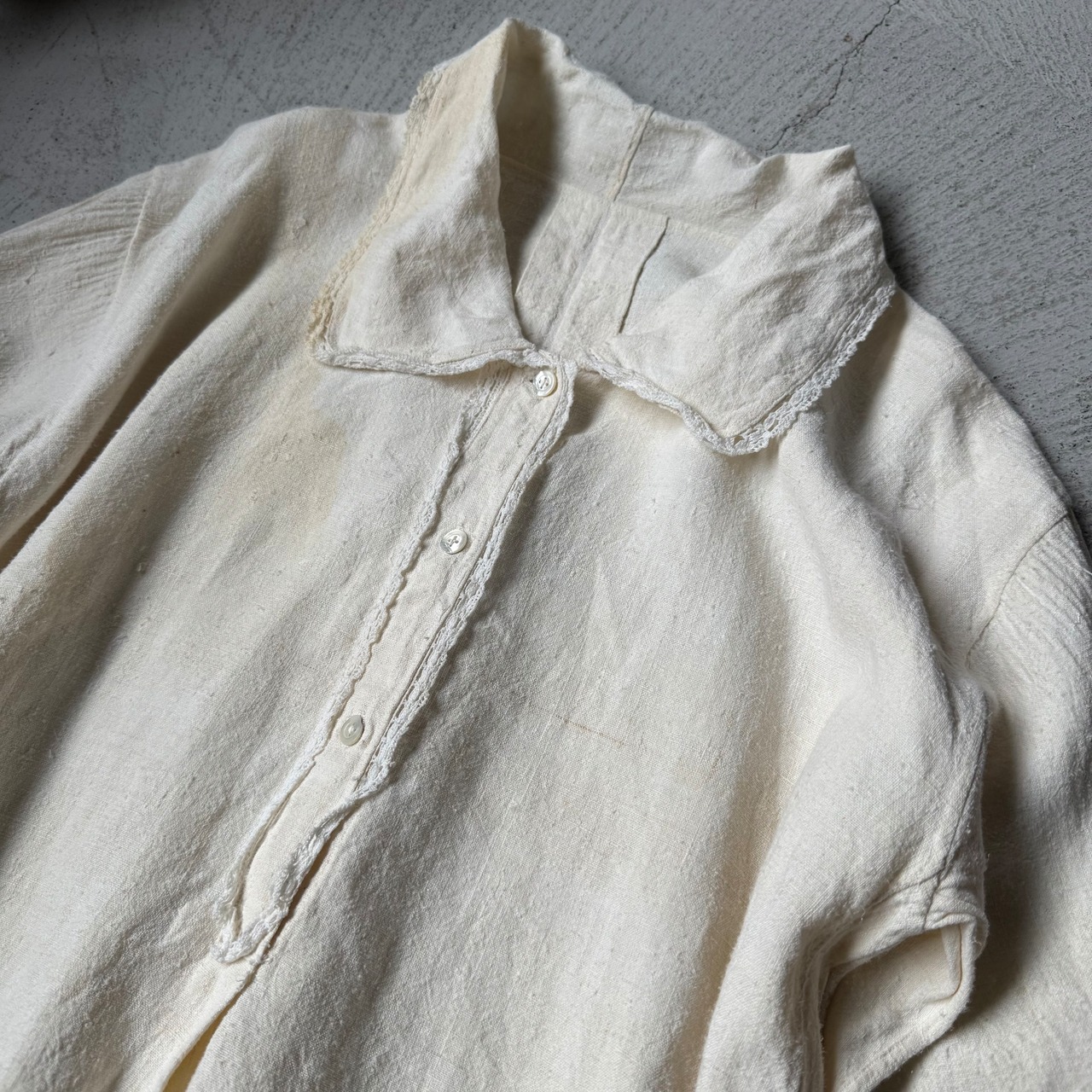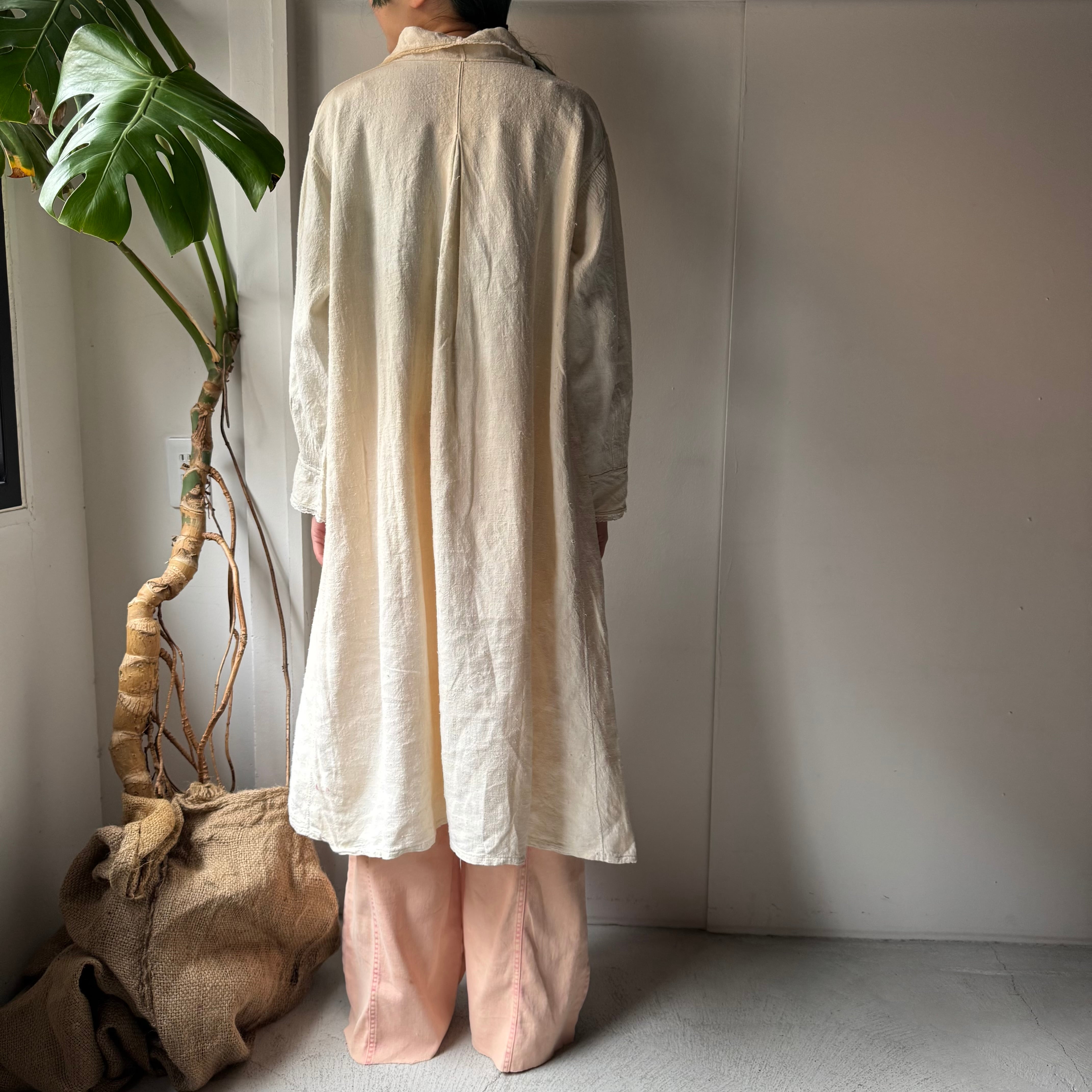 この手のアンティークワンピースは、ゴワッとしたようなリネン素材のものが多いですが、こちらは柔らかな風合いの素材(恐らくコットン×リネンかと思われます)