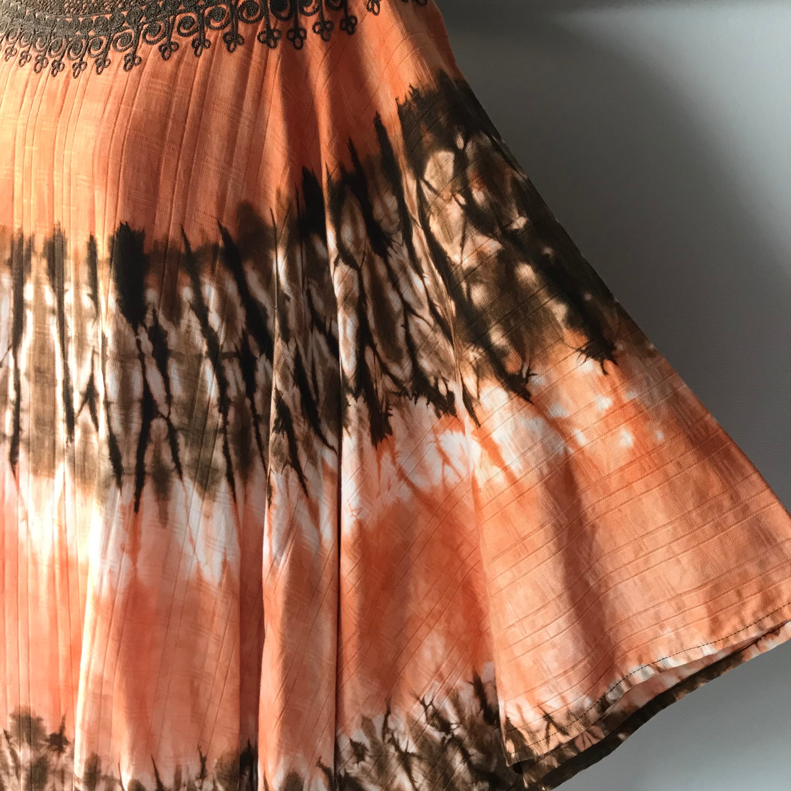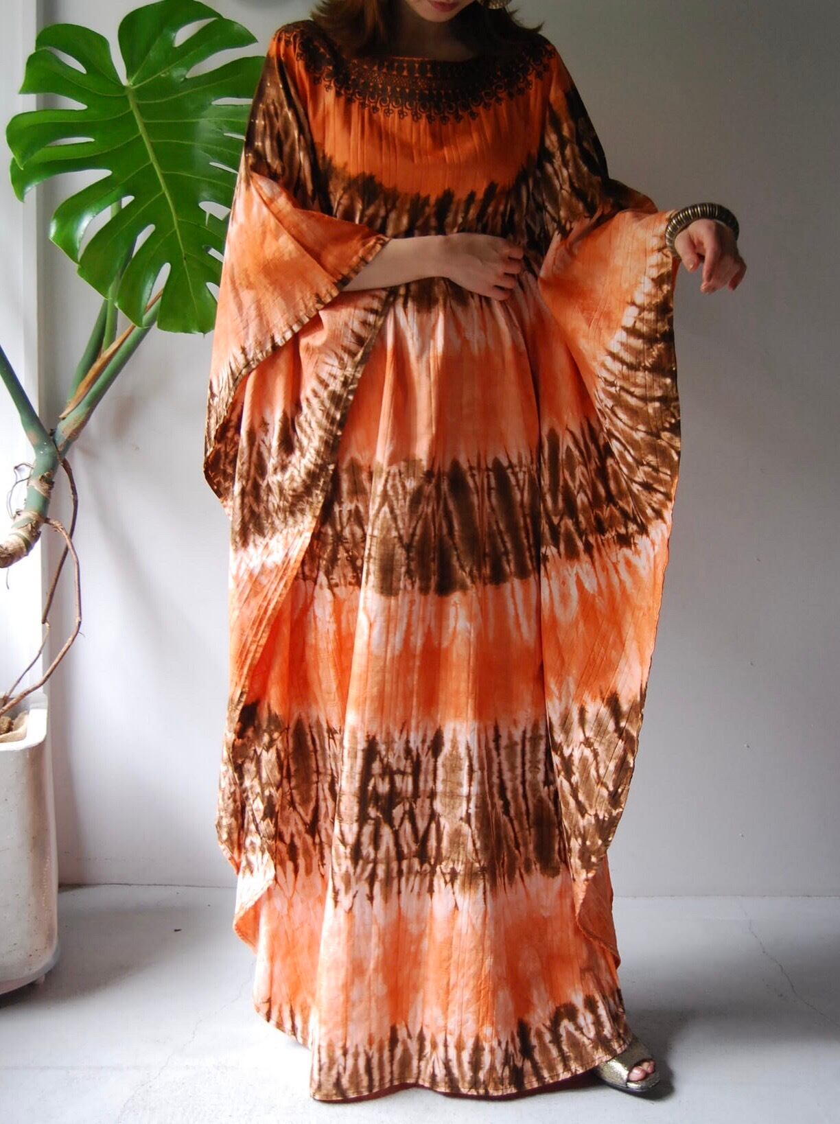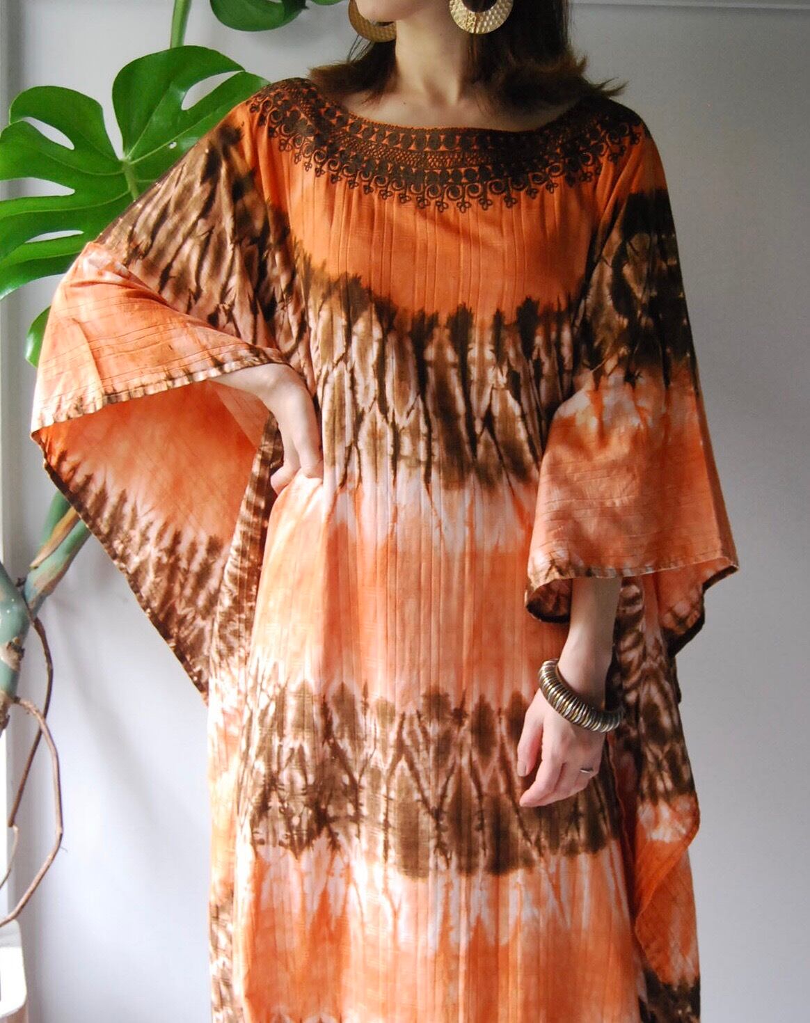 ・インパクトのあるタイダイ染めのカフタンドレス。
