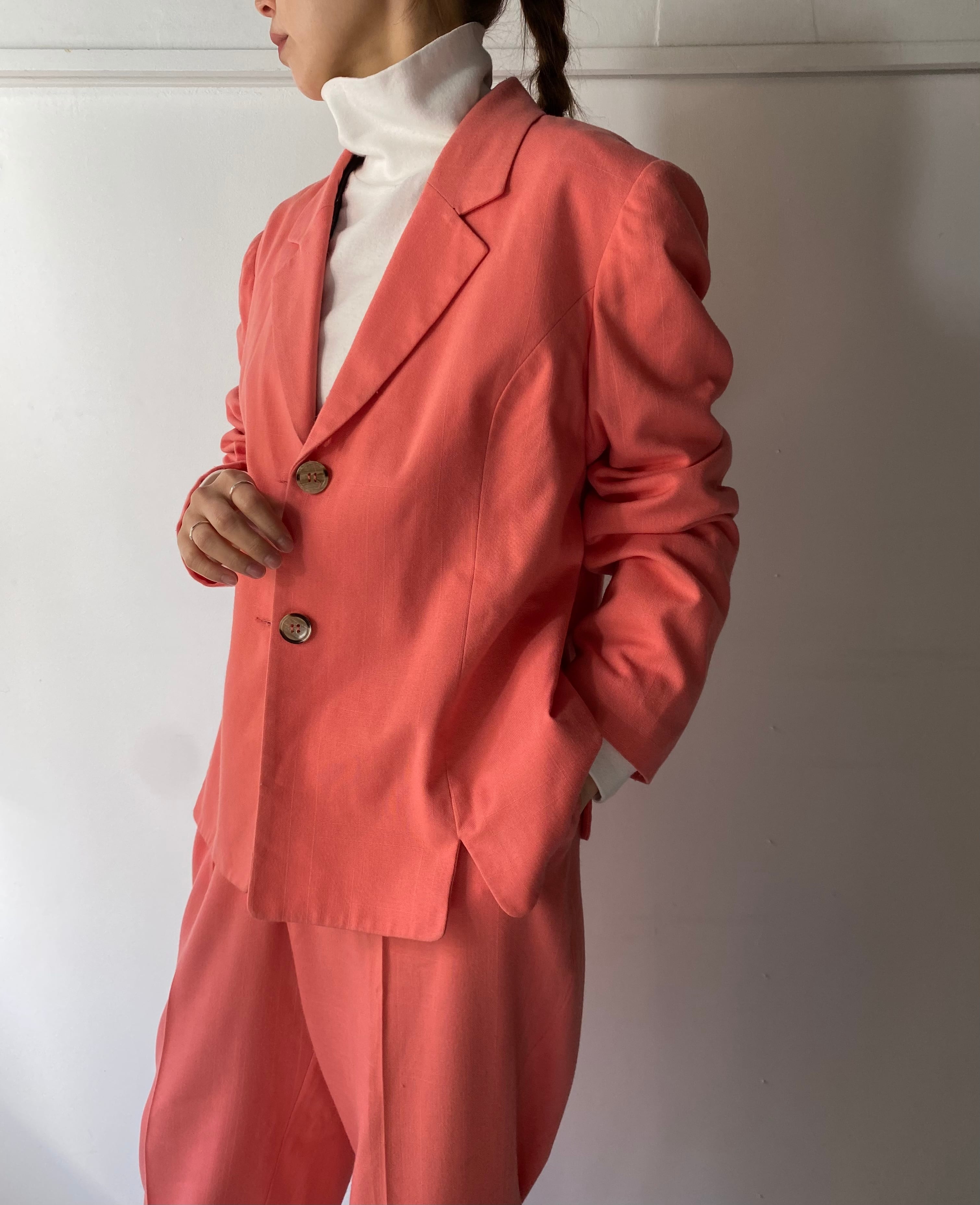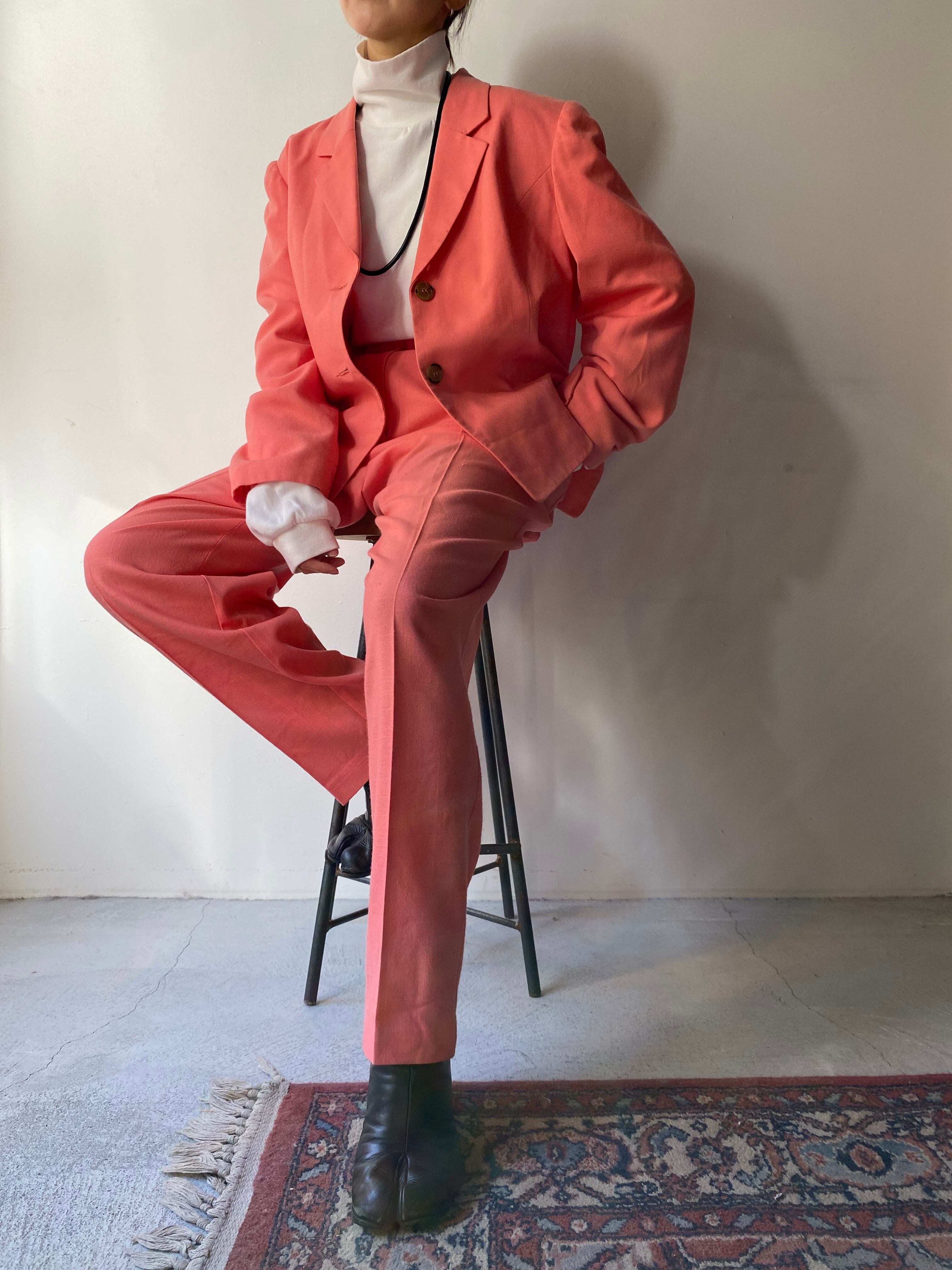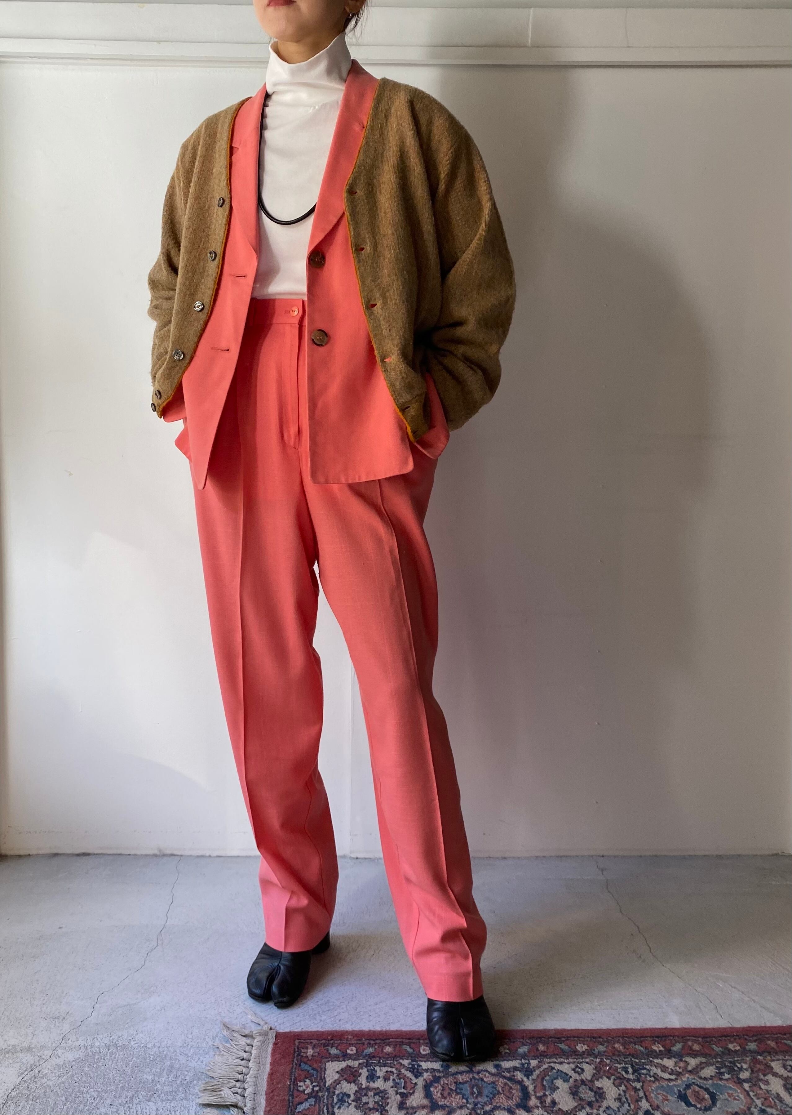 ・上品で落ち着いたカラーリングのピンクが上品なセットアップスーツ。