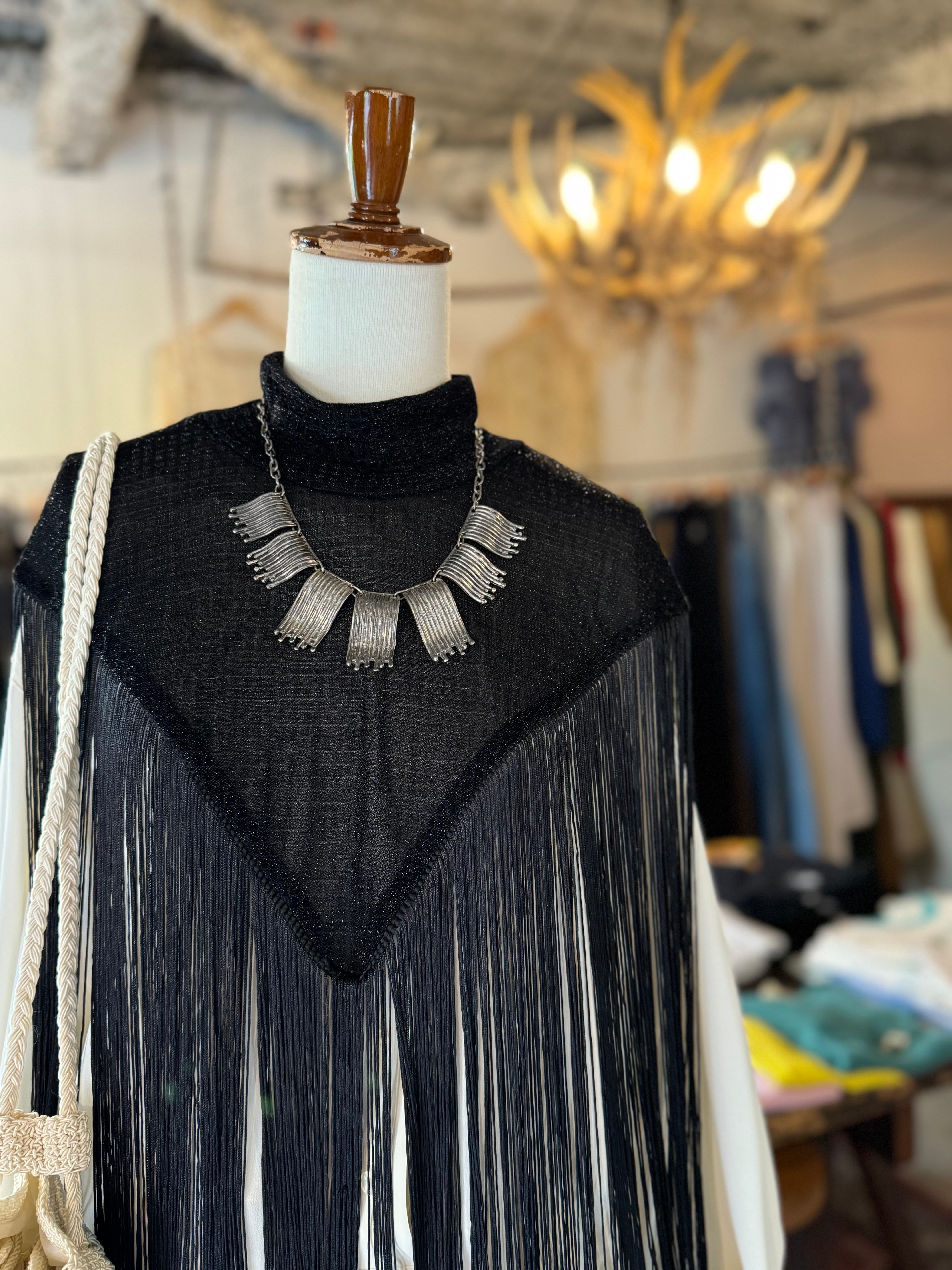 ・身に付けるだけでコーディネートに絶対的インパクトをプラスしてくれるフリンジビブ。